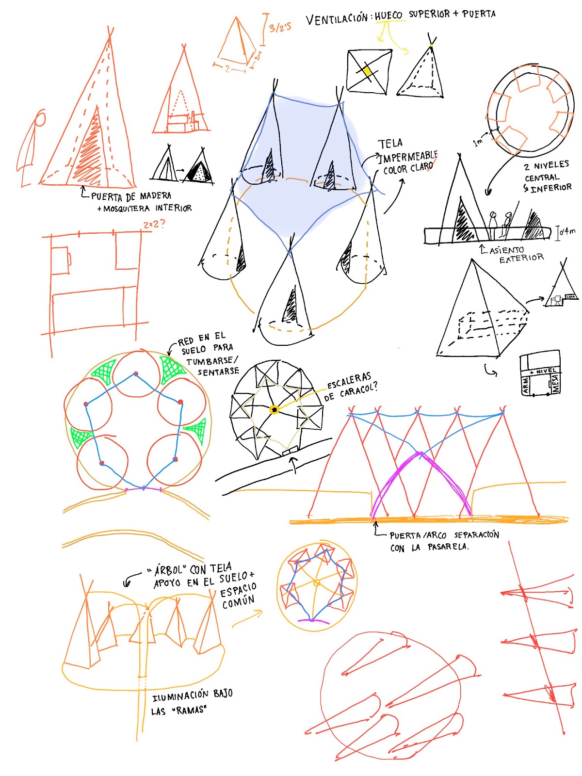 3) Esta vez los cubículos se ordenan en tres niveles diferentes. El conjunto está cubierto de una envolvente con forma parecida a la propuesta inicial de la primera parte del ejercicio.